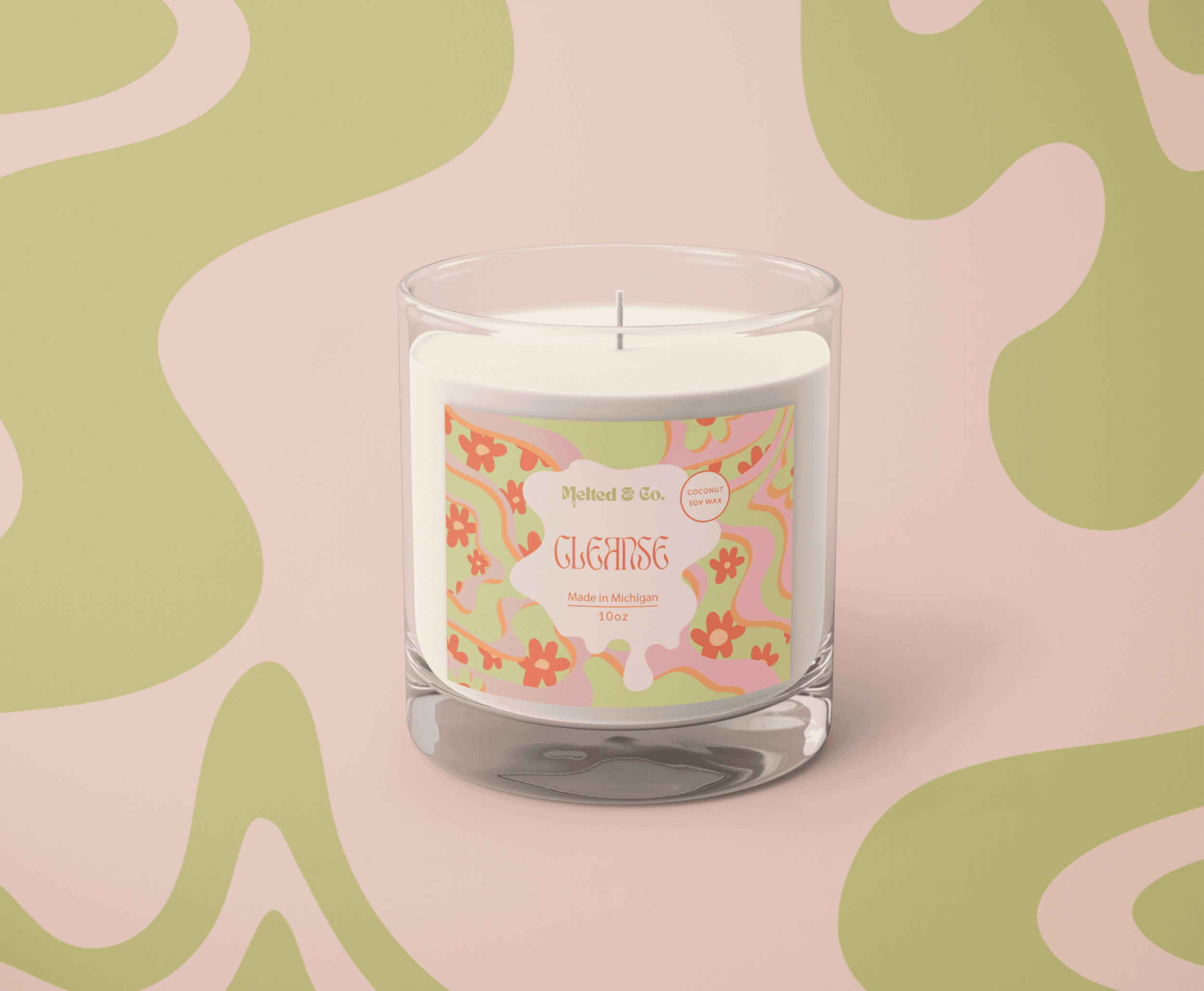 A vivid visual identity for a Michigan-based candle house, characterized by a playful interplay of retro-inspired curves and modern, color palettes.